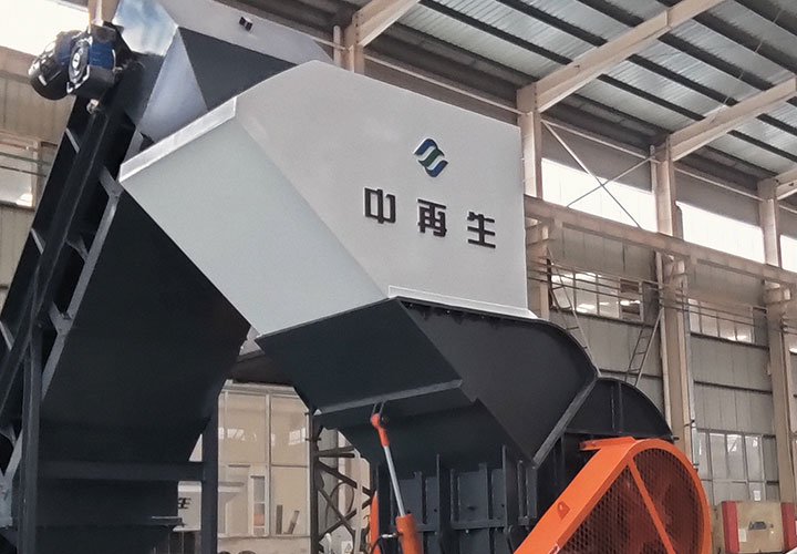 破碎線主機(jī)殼體采用特厚鋼板制造,內(nèi)襯為高錳鑄鋼件,可更換;主機(jī)轉(zhuǎn)子盤安裝于水平軸上,轉(zhuǎn)子盤圓周分布有銷軸,軸向懸有錘頭;主軸用滾珠軸承支撐,循環(huán)油強(qiáng)制潤(rùn)滑冷卻,并裝有溫度傳感器;進(jìn)料口裝有液壓輥筒喂料裝置,位置一高一低,同向旋轉(zhuǎn),能將大件松散物料壓扁,送入破碎腔內(nèi)。