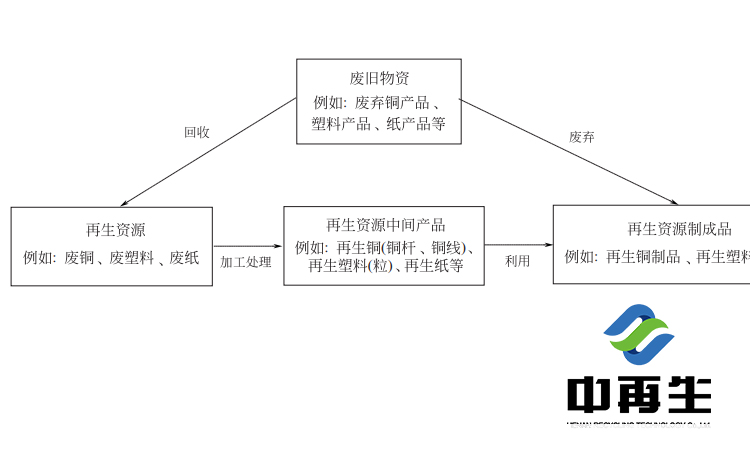 再生資源是指來源于社會生產(chǎn)和生活消費(fèi)過程的各類廢棄物,經(jīng)過回收、加工和利用等環(huán)節(jié),可以重新獲得使用價(jià)值的物質(zhì)。此外,對符合國家環(huán)??刂茦?biāo)準(zhǔn)的進(jìn)口可用作原料的固體廢物也是中國再生資源的一個(gè)重要來源。需要注意的是,再生資源與再生資源產(chǎn)品的概念有區(qū)別。例如再生銅、再生鋁、再生塑料等概念是指廢舊銅、鋁和塑料經(jīng)過回收、分揀、熔煉、拉絲造粒等環(huán)節(jié)加工而成的中間再生資源產(chǎn)品,為制造企業(yè)深加工得到再生資源的制成品提供原料,如圖所示: